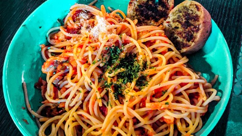 Efter gudstjenesten går vi over i menighedshuset, hvor der er spaghetti til alle og man må tegne på bordene.